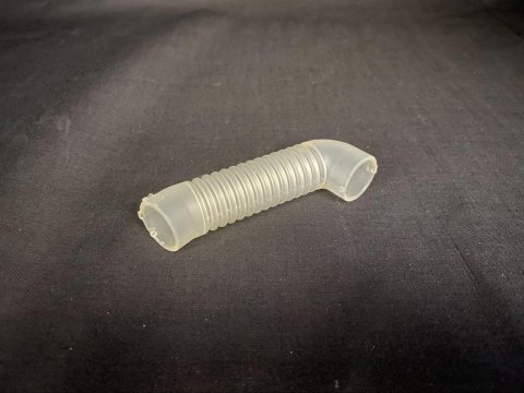 通常の連結ホースの製作依頼でしたが、若干の位置調整もしたいとのご要望があり、 胴体部をジャバラ形状に設計し直して製作しました。 他社で金型が要ると言われたが、安価な樹脂型で20個製作しました。
